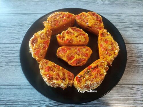 Pe blogul Retete cu Gina Bradea puteti sa gasiti si alte retete de aperitive, cel putin la fel de gustoase si usor de preparat precum aceasta.