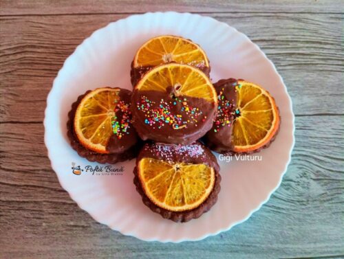 Feliile de portocale se aseaza pe cercurile din aluat si se coc la 190 de grade Celsius, pentru 20 minute, apoi se lasa la racit.