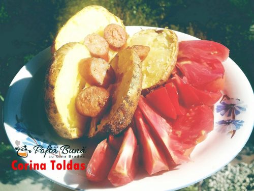 Aranjarea in farfurie se face dupa propriile preferinte. Eu am despicat cartofii la jumatate, dar nu total, si am pus rondelele de carnati deasupra. Langa, feliile de rosie completeaza farfuria atat vizual, cat si ca gust.