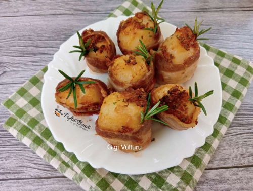 Cartofi inveliti in bacon la cuptor – o reteta simpla, aromata si tare gustoasa. Pot fi un pranz sau o cina delicioasa,se pot servi si ca aperitiv la o masa festiva. Este o reteta care se prepara rapid, este consistenta si tare buna.