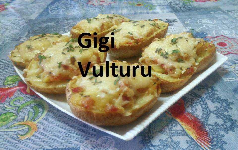 Se face umplutura, din oua, miezul de cartof sfaramat, dar nu foarte marunt, cubulete de bacon sau friptura, ardei gras, branza. Se amesteca totul si se umplu cartofii.