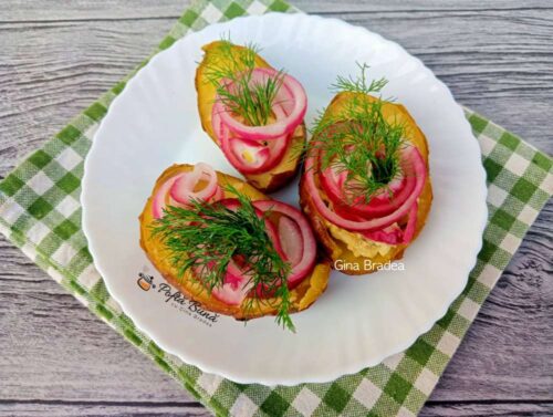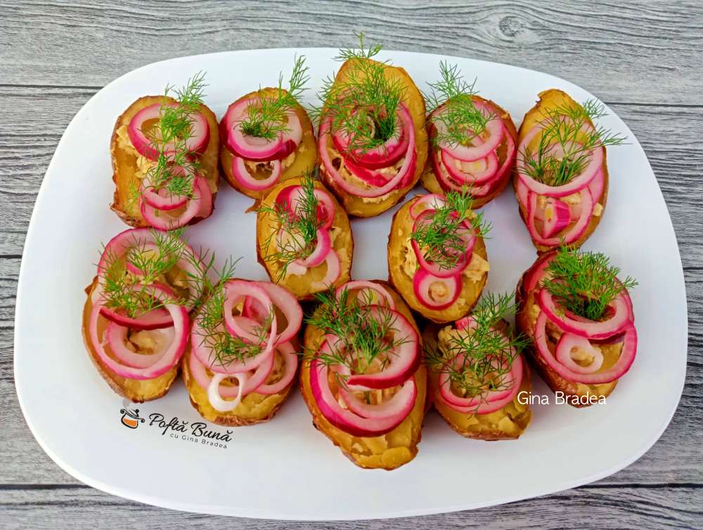 Cartofii se umplu cu aceasta compozitie si se decoreaza cu ceapa marinata si marar.