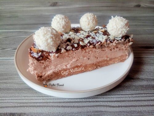 Cu ingrediente accesibile precum napolitane, mascarpone, smantana pentru frisca si ciocolata, vei obtine un desert cremos si savuros, decorat cu migdale, nuca de cocos si bomboane Raffaello pentru un aspect festiv. Aceasta reteta este ideala pentru incepatori si pentru toti cei care cauta un desert rapid, fara coacere, dar cu un gust deosebit.