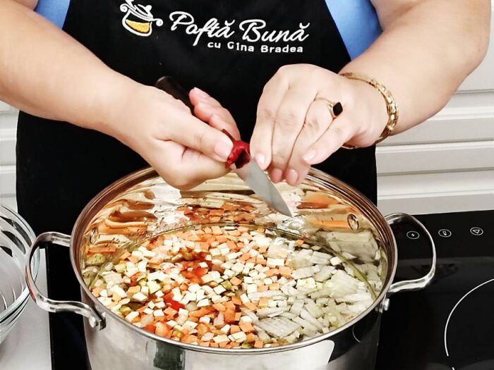 In supa de oase sau apa simapla (daca facem ciorba de post) adaugam ceapa tocata, morcovul, radacinoasele, ardeiul gras, o lingura rasa de rasa, ardeiul iute (este optional, daca nu doriti sa fie picant). Am detaliat aici cum se face supa de oase de vita.
