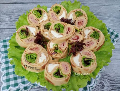 Clatite aperitiv umplute cu crema de branza, salata si prosciutto, mortadella – este o reteta delicioasa si foarte usor de preparat.