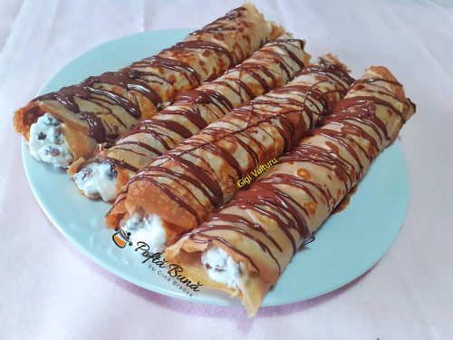 Clatitele se umplu cu crema facuta asfel: Se amesteca ricotta (urda) cu zaharul, vanilia si stafide.