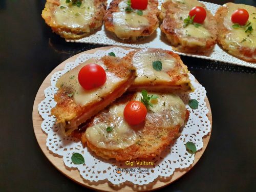 Apoi se descopera, se intorc, se pune deasupra mozzarella ramasa, rosii pentru decor si oregano si se pun la cuptor, pana se topeste mozzarella si se rumenesc putin.