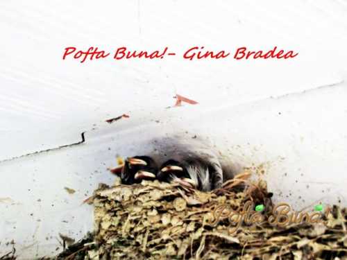 A fugit sotul imediat, a adus bormasina si 2 bucatele de lemn, am luat castronelul pe care-l foloseam sa luam porumb din sca pentru gaini si imediat a improvizat sotul meu alt cuib. A pus in castron bucatile cuibului sfaramat, apoi paie si cateva pene de la gaini si a pus pui sorii inapoi. I-am tinut intr-un tricou curat, luat de pe sarma, ne-a fost teama sa punem prea mult mana pe ei, sa nu le impregnam mirosul nostru si sa fie respinsi de parinti. I-am pupat si eu si sotul, pe fiecare-n parte, cand i-am pus inapoi si i-am rugat frumos sa se faca mari si apoi sa revina sa depuna ousoare si sa scoata si ei puisori aici. 🙂 Randunelele zburau innebunite pe-afara, cred ca mai chemasera si rude sa-i ajute, erau 4-5 randunele. 🙂