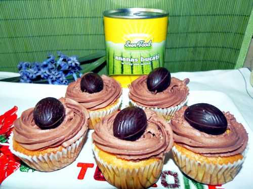 Am acceptat Provocarea Sun Food si am pregatit pentru masa de Pasti niste cupcakes cu ananas si crema de mascarpone care au fost extrem de apreciate. Acum, sincera sa fiu, nu stiu daca prajiturelele mele au fost apreciate, sau ousoarele de ciocolata pe care le-am folosit la decor, dar nepoteii mei le-au mancat pe toate. 🙂