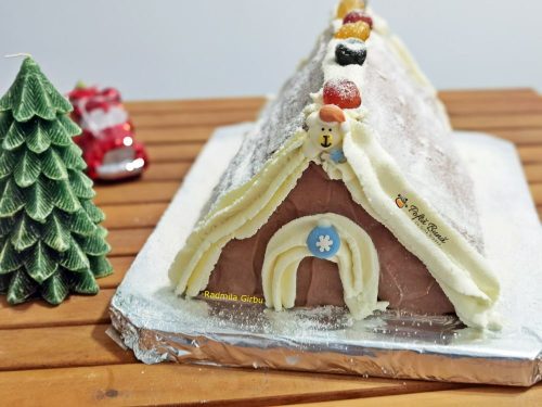 Cu grija punem peste tort folie alimentara si cu ajutorul palmelor ii oferim forma unei casute.