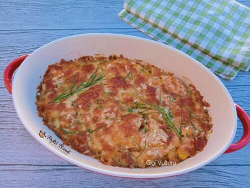 Dupa cele 40 minute se pun cascavalul si mozzarella si se mai tine tava in cuptor, pana se topesc cascavalul si mozzarella si se rumeneste totul putin.