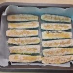Pregatim o tava tapetata cu hartie de copt pe care ii asezam unul langa altul (mie mi-au iesit 12 bucati, pot sa va iasa mai multe sau mai putine, in functie de cat de mari sunt dovleceii si de cat de grosi ii taiati), dupa care mai picuram putin ulei de masline extravirgin.