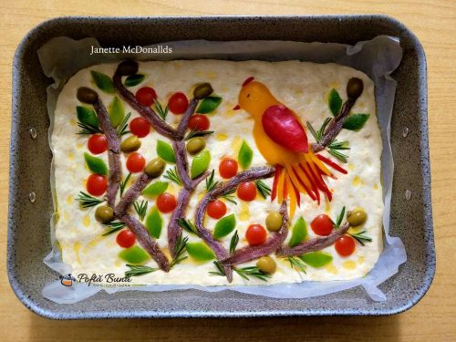 Focaccia genovese artistica – o retete simpla, o focaccia pufoasa si care arata intr-un mod cu totul special. Poate fi facuta si simpla, dar ne putem juca cu decorul si ii putem da un aspect artistic.