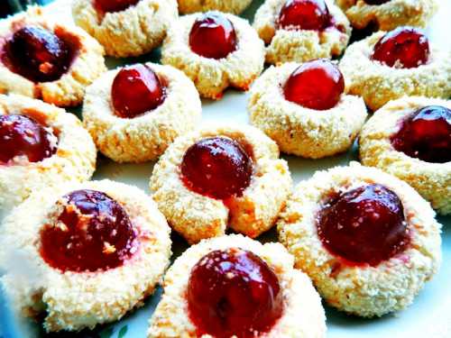In mijlocul fiecarei bilute se face o adancitura cu degetul si se asaza dulceata, o aluna, migdala intreaga sau fructe confiate. Eu am folosit acum cirese confiate.