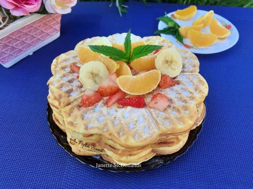 Dupa ce s-au copt se pudreaza si se decoreaza cu fructe. Asta este totul, vafele sau gofrele noastre sunt gata. 🙂