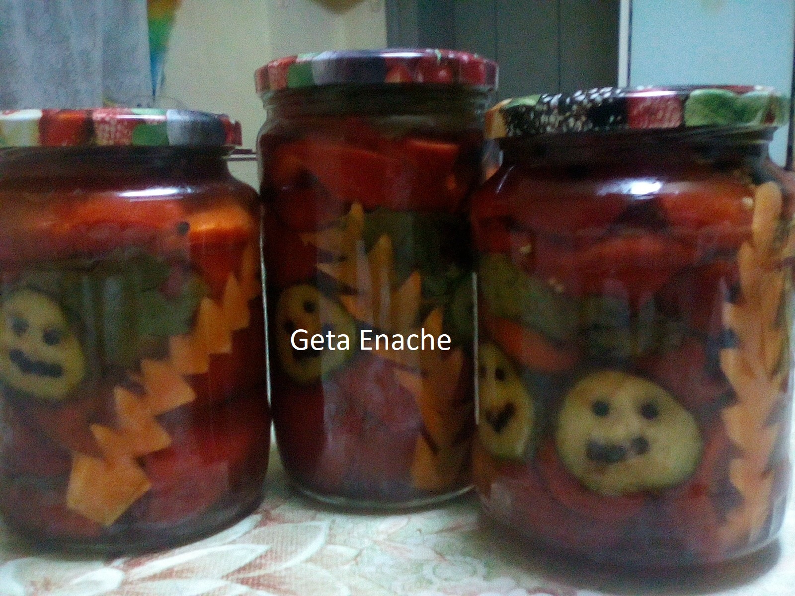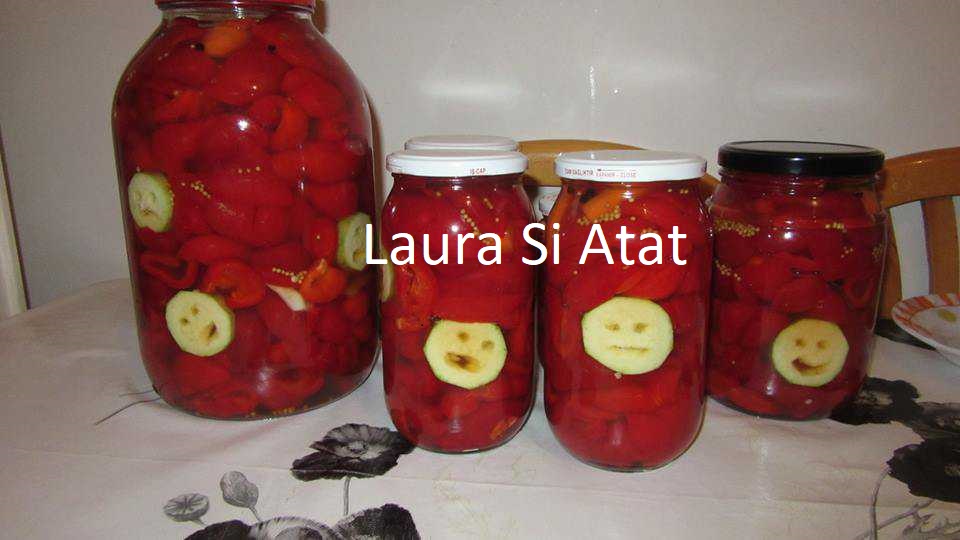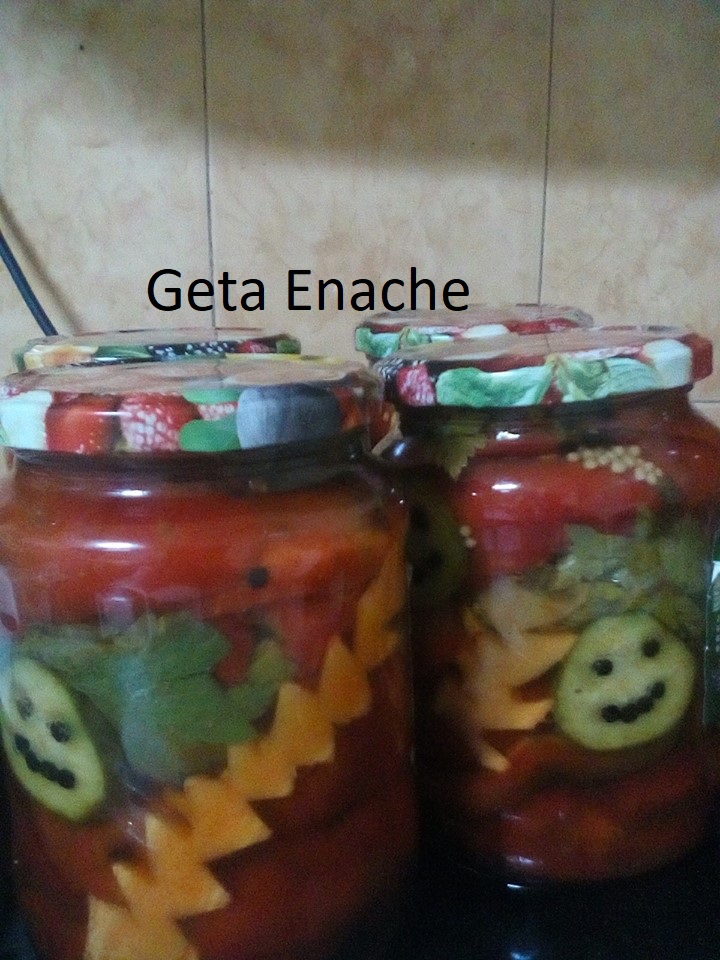 Se pregatesc ceva decoratiuni pentru borcane, daca doriti. Eu am facut braduti din morcov si cateva fete vesele din dovlecel, cu ochi si gura din boabe de piper. Am un cutitas mititel, cu lama fina, pe care-l folosesc la decoratiuni de genul asta 🙂