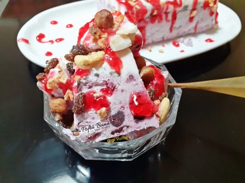Am ornat inghetata cu fructe uscate si gel de fructe de padure (eu l-am avut cumparat). Puteti folosi orice alt fel de topping doriti, de ciocolata, de fructe, siropuri, ce va place sau ce aveti la indemana.