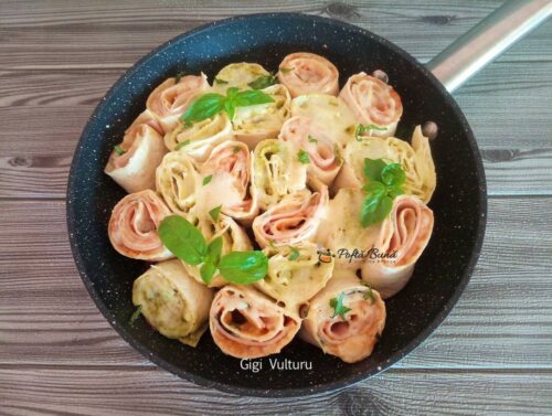 Pe celelalte doua lipii intindem pesto si crema de branza, presaram mozzarella si rulam la fel ca pe cele cu ketchup.