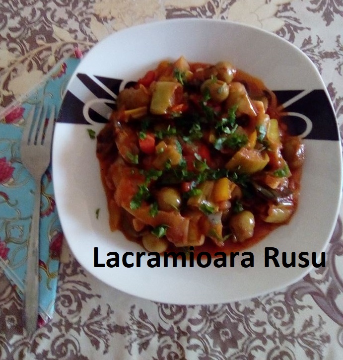 Cand ceapa si prazul s-au inmuiat bine, se adauga sucul de rosii sau bulionul pasta – vedeti retetele, maslinele, usturoiul si piper cat se ia cu 3 degete.