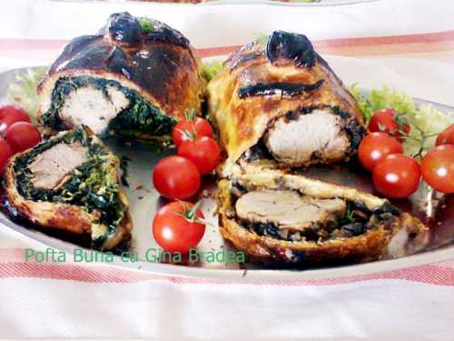 Se taie foaia de aluat in 2, se imbraca bucatile de muschiulet in compozitia de spanac, respectiv ciuperci – pe toate partile, apoi se acopera cu foietajul. Imbinarea sa vina dedesubt, deasupra sa se vada drept, frumos. Se taie surplusul de aluat si se aseaza in tava tapetata cu hartie de copt. Din resturile de aluat puteti face un decor deasupra: frunze, flori, dupa imaginatie. Se unge cu restul de ou batut, se poate presara cu mac, susan, chimen, branza rasa. Se da la cuptor, la foc potrivit, pana cand aluatul devine auriu – cam 30-50 de minute, depinde de cuptor.