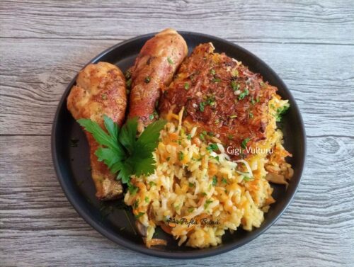 Orez cu ciuperci si ciocanele la cuptor sau air fryer – este o reteta fara prajeli, sanatoasa si foarte gustoasa. Aceasta mancare de orez se prepara foarte rapid, iar rezultatul este unul gustos si deosebit. Gatim impreuna carnea si garnitura, intr-un timp scurt avem gata o masa delicioasa.
