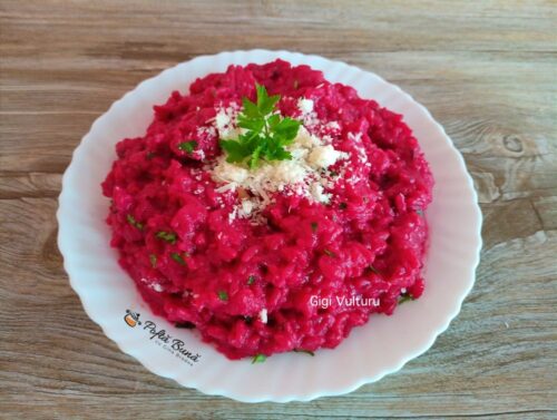 Se adauga apoi sfecla rosie fiarta si blenduita, dupa care se opreste focul si se adauga untul si cascavalul ras.