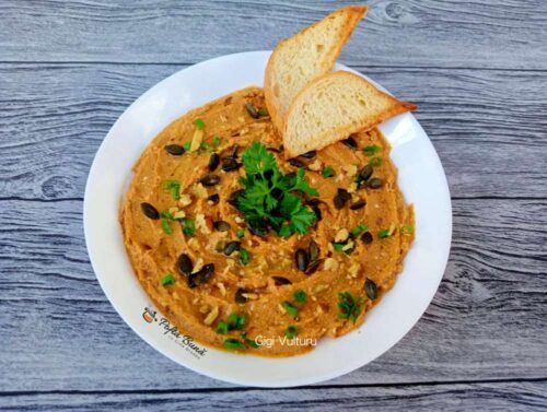 Pasta rezultatat se serveste pe paine prajita cu seminte de dovleac si susan deasupra.