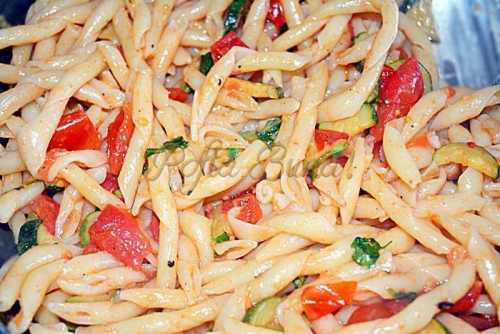 Italienii au un adevarat cult al pastelor si majoritatea mananca paste zilnic. Sunt multe feluri de paste, multe firme, multe forme si combinatii. Mereu cumpar alt tip de paste, imi place sa probez si sa experimentez. Da, pastele nu ingrasa daca nu sunt in combinatie cu lactate, carne, oua 🙂 Aceasta reteta e si dietetica 🙂