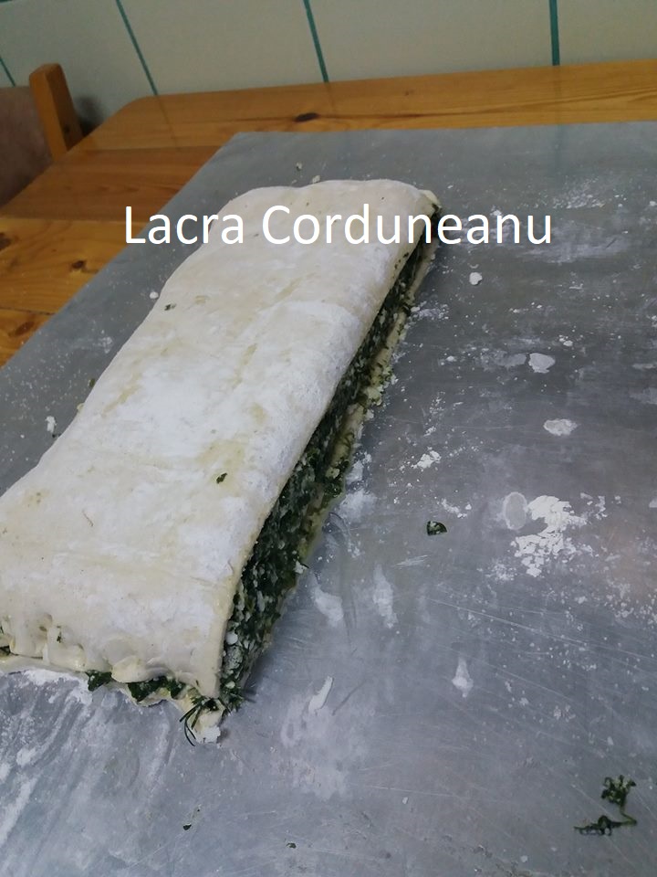 Punem deasupra o alta foaie de placinta, pe care o incretim, astfel incat sa se potriveasca bine deasupra, apoi mai adaugam o alta jumatate de foaie.