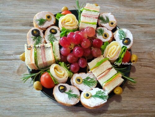 Acest platou contine trei feluri de aperitive: aperitiv din lipie, bagheta cu salata de icre si aperitiv din paine toast, branza topita, salata, salam si cascaval.