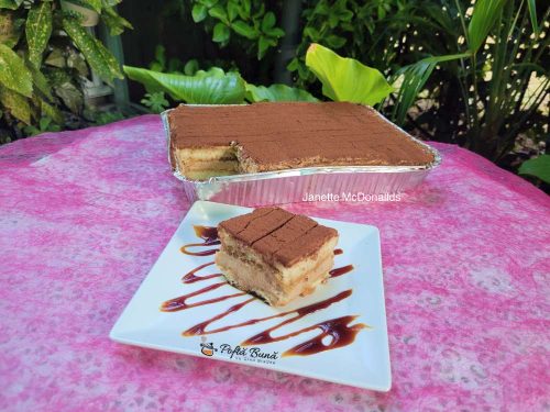Pregatim o tava (cu dimensiunea 20/30 cm), apoi scufundam fiecare piscot in siropul de zahar ars, dupa care asezam primul strat pe fundul tavii, dupa care punem crema (oprim 3-4 linguri de crema) pe care intre timp am mixat-o cu frisca pentru a avea o textura mai fina.
