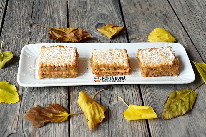 Daca vreti sa faceti aceasta prajitura de post, folositi doar umplutura de mere: se calesc putin merele cu ulei si zahar. Nu se foloseste budinca.