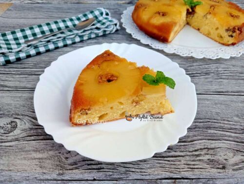 Prajitura rasturnata cu ananas si nuci este o prajitura usor de preparat si foarte gustoasa, este un desert perfect pentru orice ocazie. Are un gust dulce acrisor este racoritoare si merge de minune alaturi de un pahar de lapte sau o ceasca de cafea.