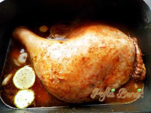 - Se baga in cuptor, acoperit, pentru inceput, timp de 20 de minute, se da focul la maxim, apoi se lasa focul potrivit, la 170-180 de grade, pentru 2 ore. Din cand in cand, se stropeste pulpa cu sosul din cratita.