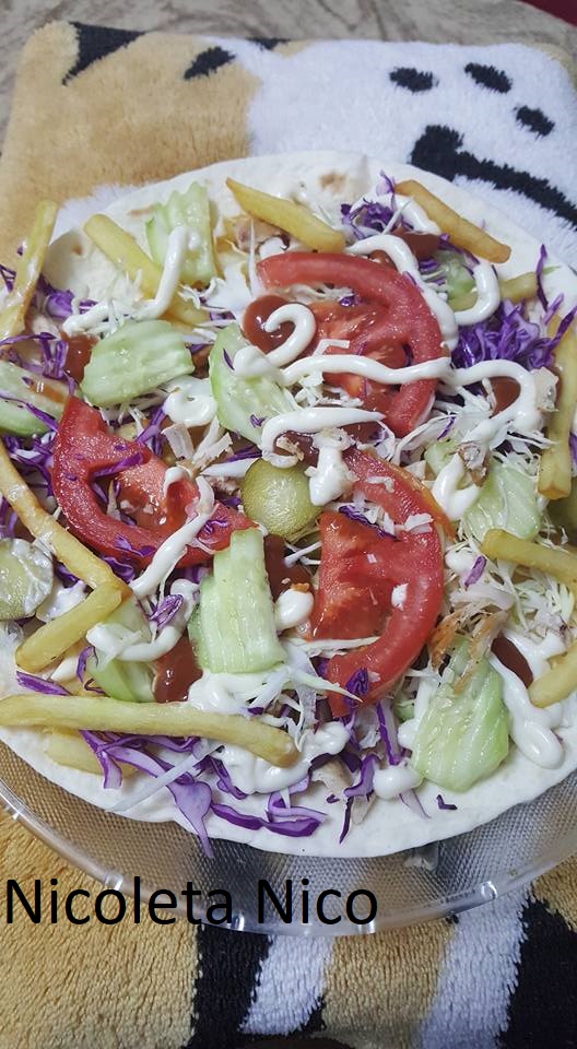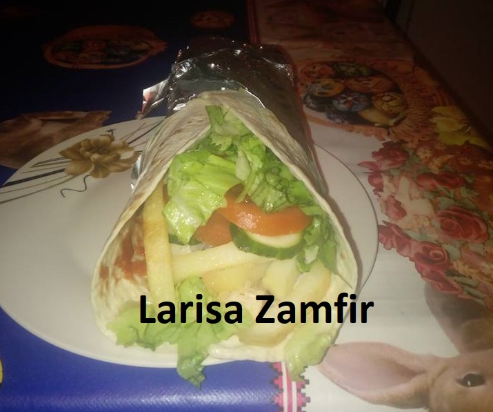 Pe lipie se aseaza cartofi prajiti, carne, salate, legume, sosuri si se ruleaza.