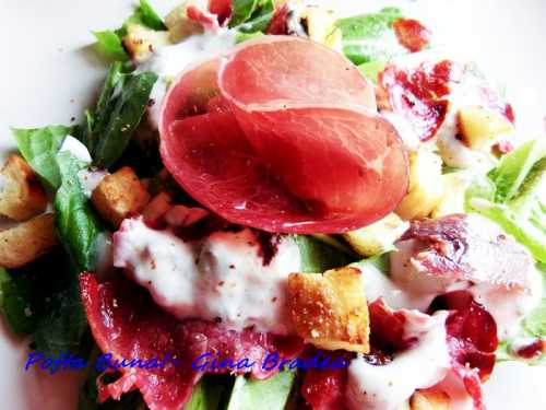La gust, ce sa va spun? Este un melanj de texturi si arome cu adevarat deosebit, mi-a placut crocantul bresaolei si al crutoanelor, combinat cu finetea sosului. Cu siguranta mai repet salata asta. 🙂
