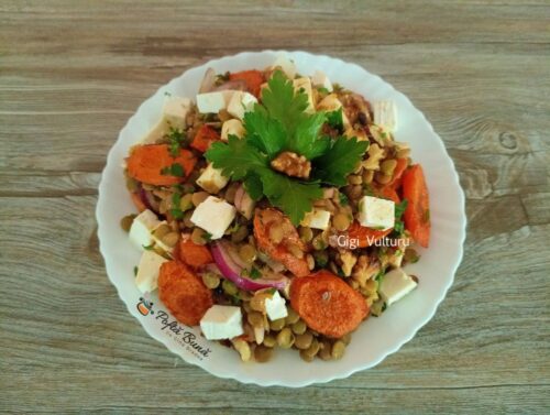 Salata cu linte, morcovi copti si branza – o salata delicioasa plina de nutrienti si vitamine. Este satioasa, se prepara rapid si este perfecta si in zilele de post, daca se inlocuieste branza cu tofu.