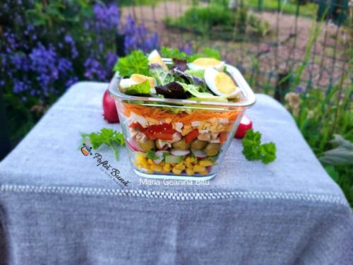Modul acesta de aranjat ingredientele nu doar ca face salata sa arate bine dar impiedica deteriorarea ingredientelor si o face sa reziste mai multe zile in frigider, conditia este sa nu fie condimentata decat in momentul servirii.