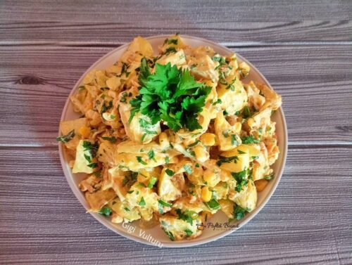 Salata de cartofi copti cu porumb, ceapa si morcov – o salata delicioasa, hranitoare si satioasa, perfecta pentru zilele calduroase de vara. Se prepara usor, din ingrediente simple si accesibile. Poate fi servita ca fel principal la pranz sau cina, ori ca garnitura langa preparate din carne sau peste.