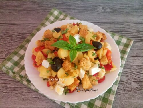 Salata de cartofi cu ardei copt, branza si crutoane