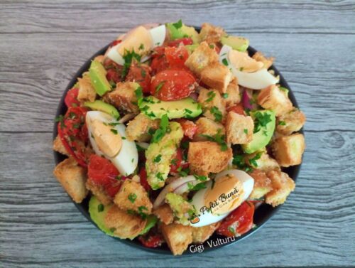 Salata de rosii cherry, ardei, crutoane si avocado – este o salata satioasa si cu un gust deosebit. Aceasta salata se poate face atat cu rosiile si ardeiul coapte, cat si cu ele crude, cum preferati.