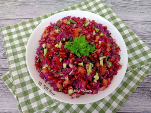 Salata de varza rosie cu rodie – o salata colorata plina de vitamine, ideala pentru vegetarieni si nu numai, potrivita si in perioada posturilor sau ca garnitura alaturi de carne, peste.