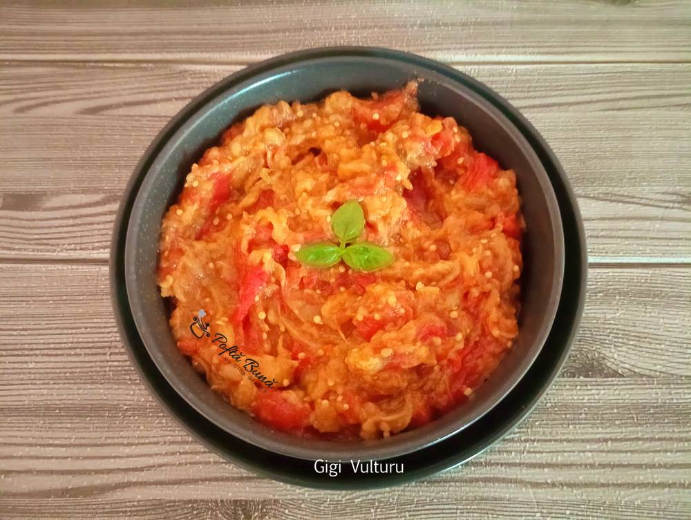 Intr-un bol se amesteca vinetele maruntite cu rosiile zdrobite, usturoi, sare si ulei.