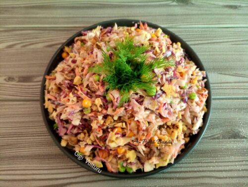 Intr-un bol se amesteca varza cu morcovul, castravetii, porumbul, mazarea, mararul si dressingul pregatit anterior.