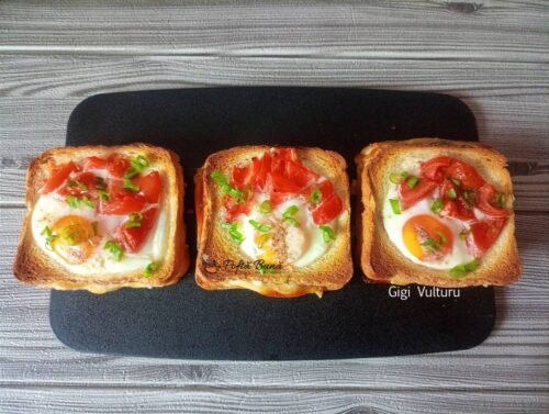 In felia de paine decupata se pune un ou in fiecare sandvis si rosii taiate cubulete.