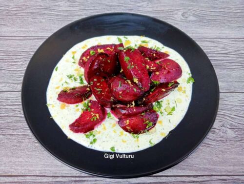 Sfecla rosie la cuptor cu iaurt aromat – este o reteta foarte usor de preparat, sanatoasa si aromata. Se poate servi ca aperitiv, garnitura sau fel principal. Este foarte bogata in vitamine si foarte gustoasa.