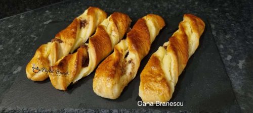 Lipim bine marginile dupa care taiem fasii de 4-5 cm pe care le rasucim pitin si le punem in tava tapetata cu hartie de copt.
