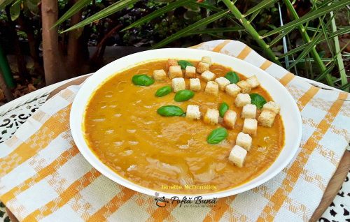 Servim supa crema de cartofi dulci si linte calda, cu crutoane. O supa crema deosebit de gustoasa atat pentru cei mari, cat si pentru cei mici!