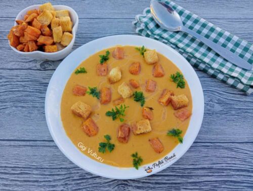 Pentru servire se pun deasupra cubulete de cartofi dulci, crutoane, patrunjel si putin ulei.
