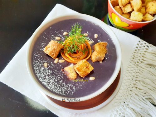 Supa crema de varza rosie: o supa cremoasa si aromata. Varza rosie se foloseste mai des la salate, dar este delicioasa si in supa crema.